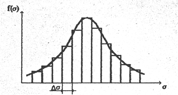 что иллюстрируется ступенчатой функцией на рис.3.6, которую называют гистограммой. Ординаты гистограммы соответствуют среднему числу разрушений (отказов) образцов для диапазона напряжений σ, σ+Δσ. Для получения плотности функции распределения используется огибающая.