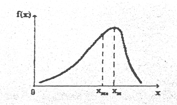 Для характеристики распределений используются также понятия моды и медианы. Мода распределения случайной величины - это наиболее вероятное её значение. Для дискретной случайной величины - это максимальное значение хi/N, а для непрерывной - значение xm, при котором плотность вероятности f(x) максимальна (см. рис.3.7.).