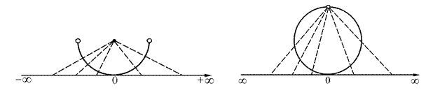 Рисунки иллюстрируют тот факт, что числовая прямая R, расширенная +¥ и -¥ топологически эквивалентна полуокружности с включенными крайними точками дуги или отрезку, а числовая прямая R, расширенная ¥ топологически эквивалентна окружности.