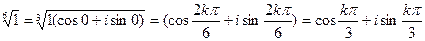 Все шесть корней шестой степени их единицы расположены на окружности единичного радиуса в вершинах правильного шестиугольника.