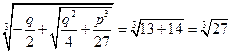 Одним из значений этого кубического корня будет число 3. Произведение этого значения на соответствующее ему значение другого кубического корня, входящего в формулу, должно равняться числу