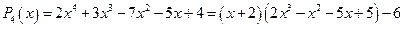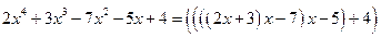 Это утверждение позволяет из всего множества рациональных чисел сразу отобрать только те, которые могут быть корнями уравнения. Установить, являются ли они корнями уравнения можно непосредственной подстановкой. При этом, удобно значение полинома в точке вычислить способом, который предложенным Горнером. Проиллюстрируем схему Горнера на конкретном примере (это верно передает суть метода и не загромождает выкладку).