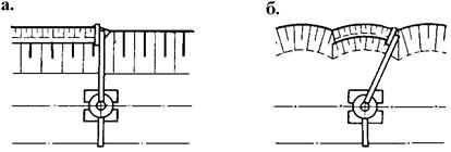 Cхема работы неповоротного роторного экскаватора по откосу уступа по откосу уступа подобна схеме работы цепного многоковшового экскаватора. При этом экскаватор передвигается вдоль фронта уступа и разрабатывает его горизонтальными слоям (а.). Горизонтальные усилия при черпании породы по этой схеме преодолеваются ходовым устройством, что сопряжено со значительными затратами электроэнергии и повышенным износом ходовых частей. По такой схеме работают чаще всего роторные экскаваторы на железнодорожном ходу, встроенные в транспортно отвальные мосты.