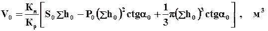 где Кн= 0,8 – 0,9 коэффициент, учитывающий неравномерность отсыпки породы в отвал; Кр = 1,1 – 1,2 – коэффициент, учитывающий разрыхление породы в отвале; hо – высота уступа отвала, м; Р0 – периметр площади основания отвала, м; α0 – угол откоса уступа отвала, градусы.