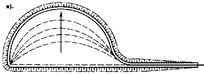 Способ перемещения фронта отвальных работ определяет схему развития отвалов в плане. Различают три способа перемещения фронта отвальных работ: параллельный (а), веерный (б) и криволинейный (в).