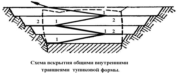Сущность способа заключается в последовательном вскрытии отдельных горизонтов месторождения наклонными траншеями, которые проходят на одном из бортов карьера во взаимообратном направлениях, оканчивающихся горизонтальными тупиковыми площадками, которые устраивают на каждом рабочем горизонте или, в карьерах большой длины, через 3 – 4 рабочих горизонта. По рабочему горизонту траншея проходится горизонтальной. Горизонтальные тупиковые площадки оборудуют маневровыми путями для разминовки груженных и порожних составов и перемены направления их движения. Тупиковые траншеи могут быть стационарными, полу стационарными и скользящими, одно-путевыми и двух путевыми.