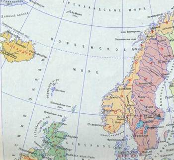Рис. 1.25. Карта наших дней. На карте: слева вверху – Исландия, Ниже – Фарерские острова, справа - Норвегия