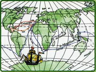 Рис. 1.42. Маршруты Христофора Колумба, Васко да Гамы и Фернандо Магеллана