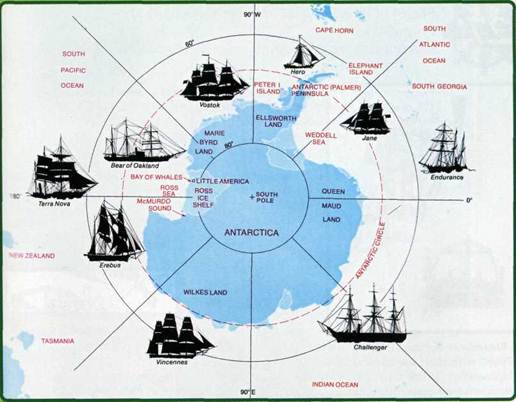 (Palmer) Peninsula – Антарктический (Пальмера) полуостров; Elephant Island – Слоновий остров; Cape Horn – мыс Горн; South Goorgia – о-ва Южная Джорджиа (архипелаг);