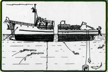 лангистов непосредственно в воду. С помощью палубной лебедки под воду опускалась стальная клетка для размещения в ней аквалангистов и защиты их от акул во время под-