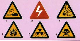 1 – разъедающее вещество (кислота, щелочь и т.п.); 2 – опасность поражения электрическим током; 3 – взрывоопасное вещество; 4 – воспламеняющееся вещество;