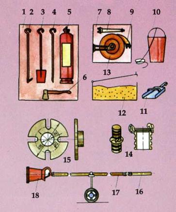 том (для набирания воды); 11 - совок для разбрасывания песка; 12 - металический ящик с песком; 13 - вьюшка для шланга; 14 - соединительная муфта шланга (гайка Рота); 15 –