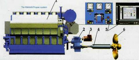 1 – дизель; 2 – редуктор с отбором мощности на валогенератор; 3 – навешенный валогенератор; 4 – гребной вал; 5 – дистанционная система контроля «Wichmatic»; 6 – винт регулируемого шага (ВРШ)
