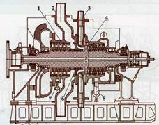 1 – турбина среднего давления; 2 – подвод пара из промежуточного пароперегревателя; 3 – подвод свежего пара; 4 – иурбина высокого давления (ТВД);