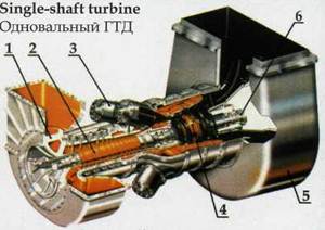 тый компрессор; 3 – камера сгорания; 4 – газовая турбина; 5 – газовыпускная камера;