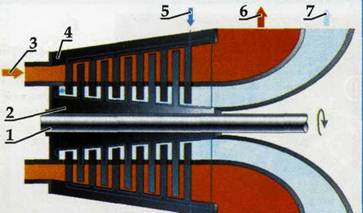 1 – вал; 2 – ротор; 3 – подвод газа; 4 – статор; 5 – впуск воды или пара; 6 – выпуск газа; 7 – выпуск пара