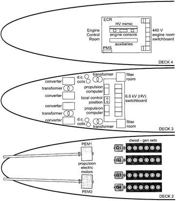 жением 6,6 кВ; палуба 4 – дизель-генераторы (4 шт.) и гребные электродвигатели (2 шт.)