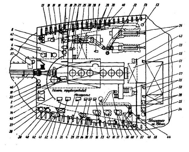 peller shaft tunnel; 47. цистерна сбора шлама - ash-collecting tank; 48. бачок продувания фильтра - filter air tank; 49. расходной бачок масла - service lubricating oil tank; 50. цистерна отстойная дизельного топлива - diesel oil separating tank; 51. цистерна отстойная тяжелого топлива - heavy fuel oil separating tank; 52. коллектор выпускных газов дизель-генераторов – diesel-generators outleting gases collector; 53. бак мерный топливный - fuel oil measuring tank; 54.сточный колодец – bilge well; 55. цистерна грязного топлива и масла - used-up fuel-oil and lubricating-oil tank; 56. сепаратор моторного топлива - diesel oil separator; 57. кингстонный ящик - sea-valve box; 58. главный трубопровод забортной воды - main sea-water piping; 59. вентиляционный воздухопровод - ventilating air-pipe-line); 60. насос ох-