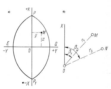 В достаточно редких случаях в геодезии применяют также полярную систему координат, используя соответствующий радиус-вектор и полярный угол, отсчитываемый от полярной оси по ходу часовой стрелки (рис.2,б). Положение полярной оси на плоскости выбирают произвольно.