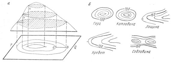 На планах и картах наиболее удобным способом изображения рельефа являются горизонтали, то есть такие условные линии, которые получаются в результате мысленного сечения участка поверхности Земли горизонтальными плоскостями, проведенными через равные промежутки по высоте (рис.10.) Другими словами, горизонтали это линии, соединяющие точки земной поверхности с одинаковыми высотами. Проекции данных горизонталей на плоскости горизонта представляют рельеф. Расстояние между соседними горизонталями в плане называется заложением. Для того чтобы отличить гору от котловины на некоторые горизонтали наносят черточки, называемые бергштрихами, по направлению ската.