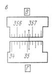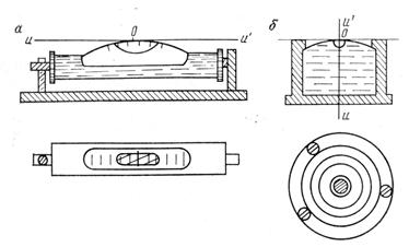 Отсчетные устройства. При измерениях углов с помощью теодолита отсчеты этих углов делаются по лимбу. Оцифровка делений шкалы лимба у оптических теодолитов выполняется через 1О по ходу часовой стрелки. Угловая величина дуги, соответствующая одному делению шкалы лимба, называется ценой деления лимба. В оптических штриховых микроскопах теодолитов Т30 в верхней части поля зрения, обозначенной буквой В нанесены штрихи вертикального круга (рис.14). В нижней части, обозначенной буквой Г – штрихи горизонтального круга. Между подписанными штрихами равномерно нанесены еще шесть делений, каждое их которых соответствует 10´. Отсчет делений по лимбу производится с помощью вертикального штриха, индекса, общего для шкал обоих кругов. Численное значение угла регистрируется на глаз с точностью 0,1´. Уровни. Для приведения плоскости лимба в горизонтальное положение, а также в других геодезических приборах используются уровни двух типов: цилиндрические и круглые Рис. Цилиндрический уровень представляет собой стеклянную трубку с внутренней поверхностью определенного радиуса. После наполнения трубки нагретым спиртом или эфиром она герметично запаивается. Охлажденная жидкость сжимается, образуя внутреннее вакуумное пространство, называемое пузырьком уровня. Трубка устанавливается в оправу, которая имеет один или два корректирующих винта. На верхней части трубки имеется шкала делений с точкой 0, расположенной в центре трубки. В поле силы тяжести Земли жидкость внутри трубки стремится к равновесию. При этом пузырек уровня будет занимать наивысшее из возможных положений, а когда ось уровня выйдет на плоскость горизонта, пузырек должен будет располагаться симметрично относительно нулевого деления, называемого нуль-пунктом уровня. В современных теодолитах цилиндрические уровни позволяют обеспечивать плоскость горизонтальной установки лимба с точностью до 10 секунд. Круглый уровень имеет низкую чувствительность, и не применятся в геодезических приборах.