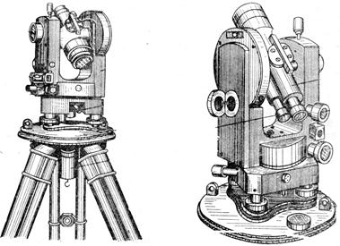 Кроме измерения горизонтальных углов, с помощью зрительной трубы тем же принципом можно измерять и вертикальные углы. Для этого необходим соответствующий вертикальный круг, вращающийся вокруг горизонтальной оси. Такой прибор, в котором с помощью зрительной трубы, вращающейся как в горизонтальной, так и в вертикальной плоскости, можно измерять горизонтальные и вертикальные углы называется теодолитом. При измерении углов теодолит с помощью станового винта прикрепляется к штативу, представляющему собой треногу с металлической головкой. Для центрирования теодолита, то есть установки центра лимба на оси двугранного угла, служит отвес.