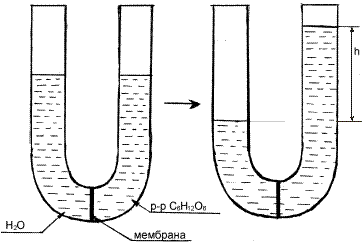 Явление осмоса можно наблюдать если U-образную стеклянную трубку разделить на 2 части (2 колена) полупроницаемой перегородкой, способной пропускать через себя только молекулы растворителя. В одно колено (например, правое) следует поместить раствор какого-нибудь вещества (глюкозы), а в другое – растворитель (Н2О). При этом уровень жидкости по обе стороны мембраны должен быть одинаковым (рис. 22). Молекулы воды могут переходить через мембрану в обоих направлениях, однако будет наблюдаться их преимущественная диффузия из растворителя (где их концентрация больше) в раствор, вследствие чего уровень жидкости в левом колене станет постепенно понижаться, а в правом – наоборот увеличиваться.