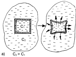 Преимущественно односторонняя самопроизвольная диффузия молекул растворителя через полупроницаемую мембрану из растворителя в раствор или из раствора с меньшей концентрацией растворенного вещества в раствор с большей его концентрацией называется осмосом.