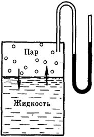 Со временем скорости обоих процессов уравняются и в системе установится динамическое равновесие, при котором число молекул растворителя, испарившихся с поверхности жидкости за единицу времени, будет равно числу молекул, перешедших в жидкость из газообразной среды. Но при этом какое-то постоянное и не меняющееся во времени число молекул растворителя будет находиться над его поверхностью, образуя насыщенный пар. Давление этого пара на жидкость называют давлением насыщенного пара чистого растворителя (р0). Его можно измерить с помощью манометра (рис. 27).