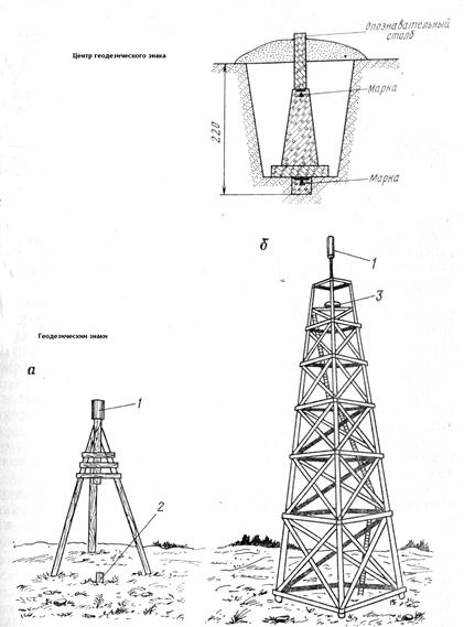 верхней части пирамид устанавливается визирный цилиндр для обеспечения угловых измерений. В зависимости от условий местности геодезические знаки могут иметь различные конструкции. В условиях открытой местности при хорошей видимости между пунктами угловые измерения производятся со штатива, установленного на земле непосредственно над центром пункта геодезической сети. В условиях леса на местности строятся сигналы высотой до 40 метров. При этом прибор для измерения углов устанавливается на специальном столике, размещенном в верхней части сигнала. В этом случае необходимо соблюдать условие, при котором центр столика, центр геодезического пункта и ось визирного цилиндра должны находиться на одной отвесной линии. В городах с многоэтажной застройкой пункты триангуляции устанавливаются на крышах высотных зданий. Этот пункт представляет собой кирпичный или бетонный столбик с визирным цилиндром. Столбик служит для размещения на нем угломерного прибора. Пункты высотной государственной геодезической сети представляют собой специальные знаки, а именно: стенные реперы, марки или грунтовые реперы. Стенные реперы и марки закрепляются в стенах фундаментальных зданий. Отметка марки соответствует центру отверстия в диске марки, в которое подвешивается нивелирная рейка. Отметка стенного репера соответствует полочке, на которую устанавливается рейка. Основным высотным знаком геодезической государственной сети является стенной репер. Если вблизи пункта опорной геодезической сети нет фундаментальных зданий, то для его закрепления закладывается грунтовый репер, состоящий из стальной трубы или отрезка рельса. Эти детали из металла заделываются в бетонные монолиты. Сверху стальной трубы закладывается марка со сферической головкой. При нивелировании за начало отсчета принимается верхняя часть головки. Пункты съемочных геодезических сетей закрепляются на местности временными знаками: деревянными столбиками, колышками, отрезками металлических труб и др. Координаты всех пунктов плановой геодезической сети, а также отметки пунктов высотной геодезической сети заносятся в специальные каталоги, в которых кроме названия пунктов дается описание их расположения.