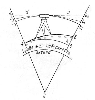 Рис.. Схема влияния кривизны земли и рефракции на определение превышений
