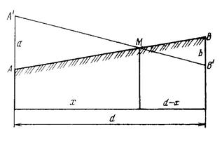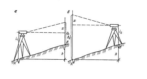 3. Ось цилиндрического уровня должна быть параллельна визирной оси зрительной трубы. Данное условие является основным при поверках нивелира. Поверка этого условия производится двойным нивелированием одной и той же линии с её разных концов (рис.40). Линия должна быть длиной не менее 50 метров. Концы её закрепляются колышками. Вначале устанавливают нивелир в точке А так, чтобы окуляр зрительной трубы находился на одной отвесной линии с данной точкой. С помощью круглого уровня приводят ось вращения нивелира в отвесное положение и измеряют высоту от точки А до центра окуляра i1. В точке В устанавливают нивелирную рейку и снимают по ней отсчет b1. Если визирная ось зрительной трубы и ось цилиндрического уровня нивелира непараллельные, то в величину отсчета войдет неучтенная ошибка x. Из рисунка следует, что превышение h = i1 – (b1 – x). Далее устанавливают нивелир в точке В. Измеряют высоту i2 от точки В до центра окуляра зрительной трубы и снимают отчет b2 в точке А. Тогда превышение h = (b2 – x) - i2. Следовательно: