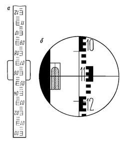 Рис. Нивелирная рейка и рейка в поле зрения трубы.