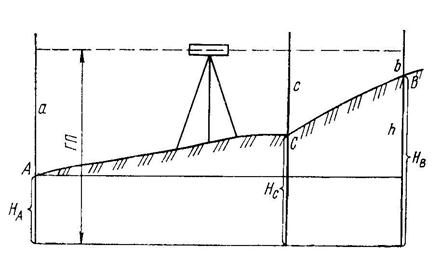 мм, где n – число станций на 1 км хода, при n > 10. Если невязка допустима, то её величину распределяют поровну с обратным знаком в превышения каждой станции. Сумма поправок должна равняться невязке с обратным знаком. Сумма исправленных превышений должна равняться нулю для замкнутого нивелирного хода или разности отметок начального и конечного репера для разомкнутого нивелирного хода. После этих расчетов вычисляют отметки связующих и промежуточных точек. При этом отметки промежуточных точек вычисляют с помощью понятия горизонт прибора ГП = H А + а, где H А – отметка точки А, а – отметка горизонтального луча нивелира. H с = ГП – с. Другими словами отметка промежуточной или плюсовой точки равна горизонту прибора минус отчет по рейке в этой точке.