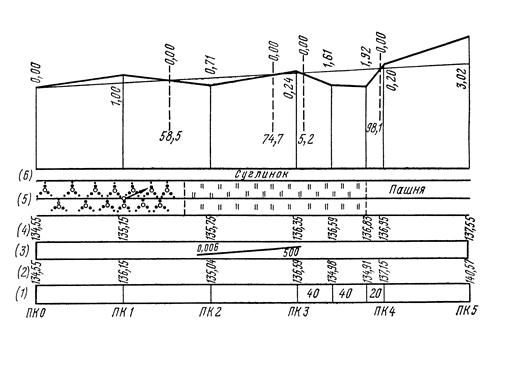 Составление профиля начинают с нанесения пикетов и плюсовых точек, заполняя графу расстояний. Наименование плюсовых точек на профиле не указывают, а их расположение показывают расстояния в выбранном масштабе. Через каждую точку пикета проводят вертикальную линию. Если расстояния между пикетами равны 100 м, то на чертеже они не обозначаются. В графу 2 записывают отметки пикетов вместе с плюсовыми точками. В графы 3 и 4 заносятся проектные данные сооружения, а именно уклон и проектные отметки трассы. Графа 5 состоит из оси трассы с указаниями точек поворота. В графе 6 показывают характер грунта. Далее на одной из утолщенных линий миллиметровой бумаги, принятой за линию условного горизонта, в масштабе откладывают отметки пикетов и плюсовых точек. Отметку условного горизонта выбирают так, чтобы самая низкая точка профиля располагалась выше линии условного горизонта на 4-6 см. Все нанесенные по отметкам точки последовательно соединяют прямыми линиями, получая, таким образом, профиль трассы. После составления профиля трассы выполняют проектирование, дороги, исходя из условия минимального объема земляных работ, уклонов, обеспечивающих безопасность движения транспорта и стока воды. Проектные отметки, лежащие на прямой профиля, вычисляют по формуле: Hk = Hk-1 + ud, где u уклон трассы, d - расстояние между отметками. Разность между проектной отметкой и высотой точки трассы называется рабочей отметкой, которая показывает высоту насыпи или выемки земли в данной точке. Рабочие отметки вычисляются для всех точек профиля и записываются над проектной линией, если они относятся к насыпи, и под проектной линией, если в данной точке необходима выемка земли. При переходе от насыпи к выемке располагается точка нулевых работ На профиле требуется указывать расстояние от этой точки до ближайшего младшего пикета.