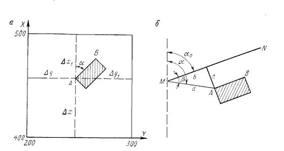 ХА = Х + ΔХ; УА = У + ΔУ; где Х и У – координаты левого нижнего угла координатной сетки, ΔХ и ΔУ – расстояния, взятые графически с плана. С учетом возможной деформации бумаги формулы необходимо откорректировать: ХА = Х + L/(ΔХ + ΔХ1)× ΔХ;