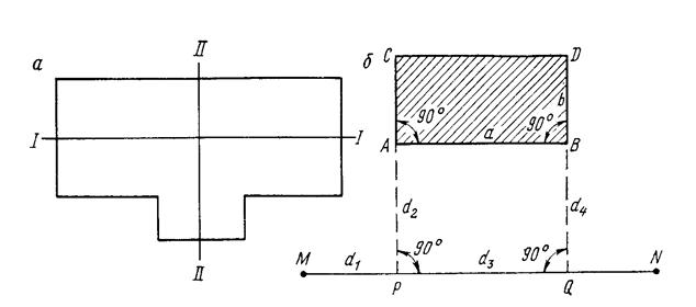 Сущность способа прямоугольных координат заключается в том, что вдоль прямой линии MN откладывают отрезок d1, а затем с помощью теодолита из полученной точки Р восстанавливают перпендикуляр длиной d2. В результате этих построений получают точку А левого угла здания. По аналогии с точкой А получают точку В. При этом ось АВ параллельна линии MN. Для контроля правильности построения измеряют длину линии АВ и определяют ошибку, допущенную при её построении. fd = АВизм – АВпр. Относительная ошибка в длине выносимой линии АВ = а должна находиться в пределах от 1:2000 до 1:10000 в зависимости от вида и назначения разбиваемого здания или сооружения. Для промышленных зданий относительная ошибка должна быть наименьшей. Линия АВ является основной для разбивки всех других осей сооружения. Построением на местности прямых углов в точках А и В и построением проектных линий АС и BD получают на местности проектные точки С и D. Для контроля производят измерения линии CD и диагоналей AD и ВС и сравнивают эти расстояния с их проектными значениями. Разница между численными значениями проектных и измеренных величин не должна выходить за допустимые пределы. В том случае, когда разбивочная ось АВ не параллельна исходной линии MN, положение точки А необходимо определять с помощью решения соответствующих треугольников с использованием известных тригонометрических формул. Необходимые для решения значения горизонтальных углов можно измерить на плане с помощью транспортира. Способ прямоугольных координат также широко используется при перенесении на местность проектов зданий с использованием соответствующей строительной сетки. Допустим, что требуется произвести разбивку осей здания по известным координатам точек их пересечения. В этом случае, например, для построения оси АВ сооружения требуется вычислить длины отрезков ΔxA, ΔyA, ΔxB, ΔyB и отложить длины этих отрезков на местности по соответствующим перпендикулярам. После этого на местности определятся проектные точки А и В. Далее таким же способом получают на местности проектные точки С и D. После чего производят контроль выполненных разбивочных работ.
