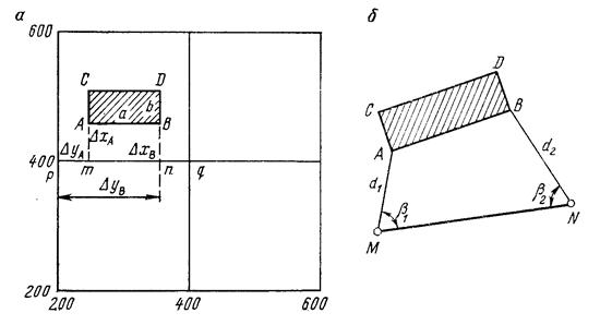 Рис. Схемы перенесения на местность осей сооружений: а - от строительной сетки; б - полярным способом.