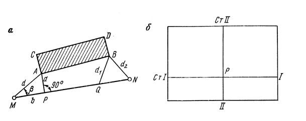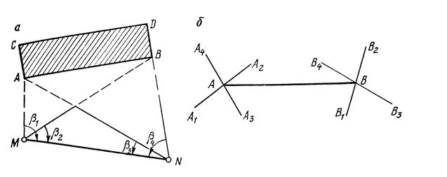 При затруднениях в измерениях на местности длины линий для разбивки сооружений в геодезии применяется метод прямой угловой засечки. Сущность способа угловых засечек заключается в построении на местности углов β1 и β2, а также β3 и β4, образованных исходной стороной и направлениями с её конечных точек М и N на определяемые точки А и В. При этом углы засечки не должны быть менее 30О и более 150О.