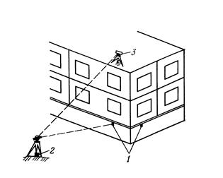 Полученные расстояния должны быть равны расстояниям между соответствующими точками на исходном горизонте. Число точек разбивочной сети, необходимых для передачи на монтажные горизонты, зависит от размеров здания. Однако их всегда должно быть не менее трёх. Перенесенные точки закрепляют знаками и относительно этих знаков строят разбивочную сеть данного горизонта. Построение плановой сети на монтажном горизонте аналогично построению её на исходном горизонте. Высотная сеть на монтажном горизонте создается методом геометрического нивелирования относительно реперов, расположенных на исходном горизонте. При этом используется способ передачи отметки на высокую точку сооружения.