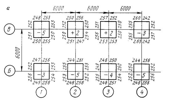 Размещение реперов и марок для наблюдений за осадками. Для наблюдений за осадками зданий необходимо иметь систему определенных точек, закрепленных специальными постоянными нивелирными знаками. Эти точки являются фундаментальными глубинными реперами, закладываемыми в стороне от сооружения, где их сохранность и неизменность геометрического положения в системе геодезических координат не вызывают сомнений в течение длительного времени. В районе наблюдений за осадками зданий должны быть установлены не менее трех глубинных реперов с учетом возможного обеспечения контроля их высотного положения с одной постановки нивелира. Глубинные фундаментальные реперы для наблюдений особо ответственных сооружений устанавливаются при измерении осадок нивелированием 1 класса. При измерении осадок нивелированием II и III классов можно использовать реперы, расположенные в грунте ниже уровня его промерзания. Наиболее распространенными типами грунтовых реперов являются трубчатые реперы, или забитые в грунт сваи. Верхняя часть трубчатого репера или сваи должна иметь сферическую головку. Кроме грунтовых реперов для наблюдений за осадками зданий необходимы так называемые контрольные осадочные марки, которые закладываются в стены сооружения и перемещаются вместе с ними. По наблюдениям за положением марок можно определить численные значения величины осадки сооружения или его отдельных частей. От правильности размещения и количества осадочных марок, заложенных в тело сооружения будет зависеть достоверность определения величин осадок. При этом необходимо учитывать удобство для наблюдения марок. Размещение марок на сооружении проводится с учетом конструкции фундамента, нагрузки на отдельные части основания, а также с учетом свойств грунта. Желательно устанавливать осадочные марки примерно на одном уровне в местах, где ожидаются наибольшие осадки. Для жилых и общественных бескаркасных зданий с кирпичными стенами и ленточным фундаментом марки размещаются по периметру через 10÷15 метров. Для промышленных сооружений и каркасных жилых и общественных зданий марки размещаются на несущих колоннах по продольным и поперечным осям не менее трех в каждом направлении. Для бескаркасных крупнопанельных зданий со сборными фундаментами марки устанавливаются по периметру через 6÷8 метров. Для сооружений со свайными фундаментами марки размещаются через 10÷15 м по продольным и поперечным осям сооружения. На доменных печах, дымовых трубах устанавливается не менее 4 марок по периметру. Для гидротехнических сооружений, разделенных на секции, устанавливают не менее трех марок на каждую секцию, а при ширине секции более 15 м – не менее четырех марок. Осадочные марки бывают различных видов. Простейшая марка представляет собой стальной уголок длиной 15 см при закладке в каменную стену и 5 см при креплении марки к стальной конструкции. Более сложная марка имеет сферическую поверхность и при закладке в стену должна выступать на 3-4 см для удобства установки рейки. В земляные сооружения типа плотин, дамб закладываются марки, представляющие собой штанги, верхний конец которых имеет головку, а нижний – башмак в виде диска с арматурными шипами. Марка устанавливается в защитную трубу, заполненную на 0,5 бетоном, в который вдавливается башмак. Сверху марка закр