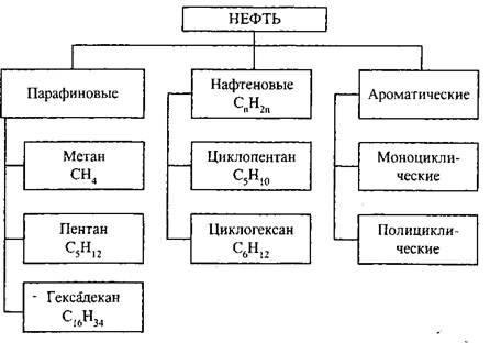 Основную массу вещества нефти составляют углероды трех главных групп: парафинные (алканы), нафтеновые (цикланы) и ароматические (арены), состав и свойства которых зависят от происхождения и места добычи нефти. Структура нефти представлена на рис. 1.1.