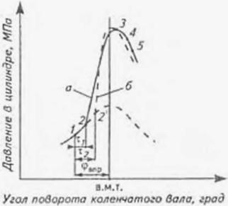 Подача топлива форсункой в камеру сгорания начинается в точке 1 за 10...20º угла поворота коленчатого вала до в.м.т. Заканчивается впрыскивание топлива у различных двигателей по-разному: как после в.м.т., так и до нее. Угол между началом подачи топлива и в.м.т. называют углом опережения впрыскивания топлива и обозначают φвпр. Продолжительность впрыскивания топлива соответствует периоду от начала до конца подачи топлива.