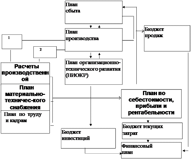 Многоступенчатость разработки планов. На рис.2.1. показан цифрами 1 и 2 порядок разработки годовых планов. На первом этапе формируются укрупненные планы сбыта и производства продукции и разрабатываются мероприятия плана организационно-технического развития. После проверки по ресурсам возможно два варианта дальнейшей работы.