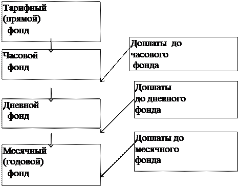 Тарифный фонд и доплаты до часового фонда образуют основную заработнуюплату (оплату за фактически отработанное время с учетом условий и интенсивности труда), доплаты до дневного и месячного (годового) фонда составляют дополнительнуюзаработную плату, то есть оплату за фактически неотработанное время.