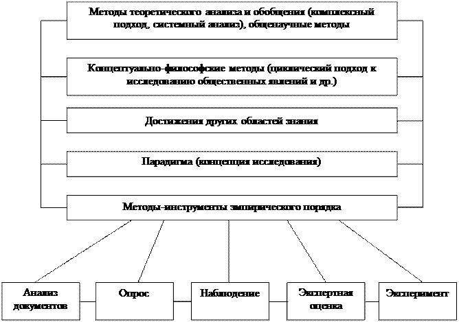 4. Методом в социологии называют способ построения и обоснования социологического знания, совокупность приёмов, процедур и операций эмпирического и теоретического познания социальной реальности. Надо различать уровень специально-научной методологии (это система собственно социологических принципов, предписаний, регулятивных норм для исследования и объяснения полученных результатов), и уровень социологического знания, воплощённый в методике, которая представляет собой систему конкретных процедур и операций, используемых в исследовании и позволяющих осуществить анализ специфического предмета. Разные теоретические подходы образуют методологию исследования и позволяют создать концепцию (например, структурный, системный, институциональный подходы). Одновременно существуют технико-инструментальные методы, служащие для непосредственного сбора и исследования социальных явлений. Структуру методов можно изобразить в виде схемы (рис.1).