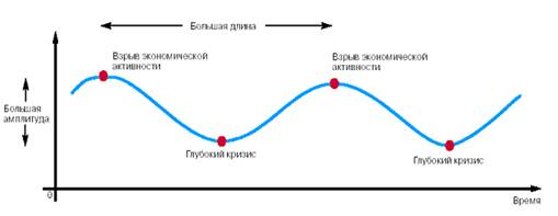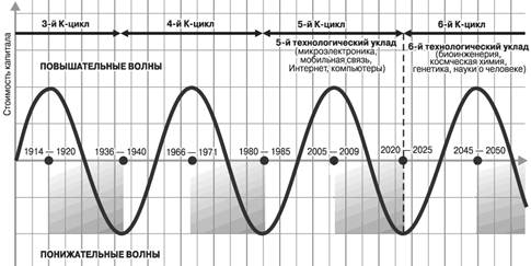 Исследовав обширный статистический материал, связанный с цикличностью чередования сменяющихся фаз в промышленном производстве, русский экономист Н.Д. Кондратьев установил в 1925 г. существование длинных волн, или больших циклов конъюнктуры. В результате этого исследования было определено, что в основе длинных волн (или К-циклов) протяженностью в 40 – 50 лет находится смена пассивной части капитала, к которой относятся здания, сооружения, коммуникации и т.п. В средние промышленные циклы протяженностью в 7 – 10 лет входит замена активной части капитала в форме станочного оборудования, транспорта и т.п. Короткие волны в 3 – 3,5 года распространялись на рыночные конъюнктурные изменения по отношению к определенным видам продукции промышленного производства.