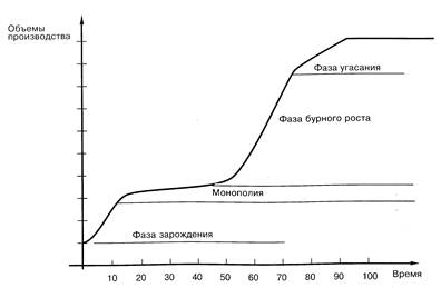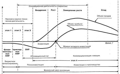 В современной концепции теории инноватики принято выделять также такие понятия, как жизненный цикл новой продукции и жизненный цикл технологии производства. Жизненный цикл продукции состоит из четырех фаз. На первой фазе проводятся исследования и разработки по созданию нововведения-продукта. Заканчивается фаза передачей обработанной технической документации в производственные подразделения промышленных организаций. На второй фазе происходит технологическое освоение масштабного производства нового продукта. Так первая, так и в особенности вторая фаза связаны со значительными рискоинвестициями, которые выделяются на возвратной основе. Последующий рост масштабов производства сопровождается снижением себестоимости и ростом прибыли. Это дает возможность окупить инвестиции в первую и вторую фазу жизненного цикла продукции. Затем наступает третья фаза, особенностью которой является стабилизация объемов производимой продукции. На четвертой фазе происходит постепенное снижение объемов производства и продаж.