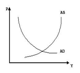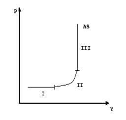 I –кейсианский участок: рост производства, постоянные цены, неполная занятость ресурсов, т.е. есть безработица, рост производства не сопровождается изменением уровня цен.