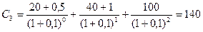 Пример. Определить целесообразность разработки новой технологии очистки сточных вод, если для проведения научного исследования организация затратила 20 млн рублей, на правовую охрану созданного изобретения – 0,5 млн рублей. Для выполнения опытно-конструкторских работ в следующем году требуется 40 млн рублей, а на освоение производства на торой год – 100 млн рублей. В процессе выполнения опытно-конструкторских работ было произведено исследование патентно-лицензионной ситуации (дополнительные затраты составили 1 млн рублей), в результате которого выявлена конкурентная технология стоимостью 90 тыс долларов США, банковский процент – 10%.